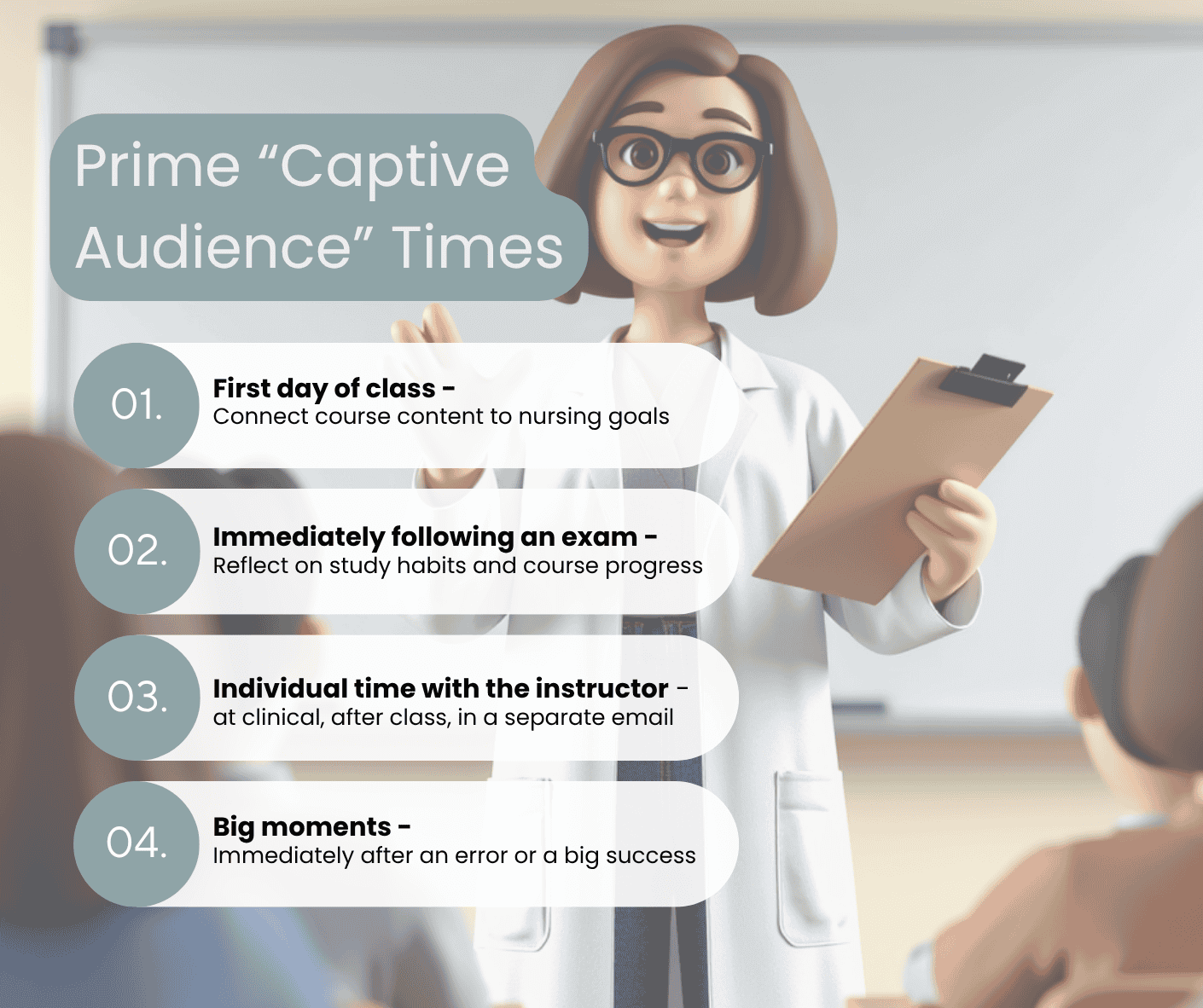 I believe there are a few critical times in their journey through a semester, and one of them is immediately following an exam. These few days are the prime time for instructors to deploy interventions that directly improve nursing student exam grades.